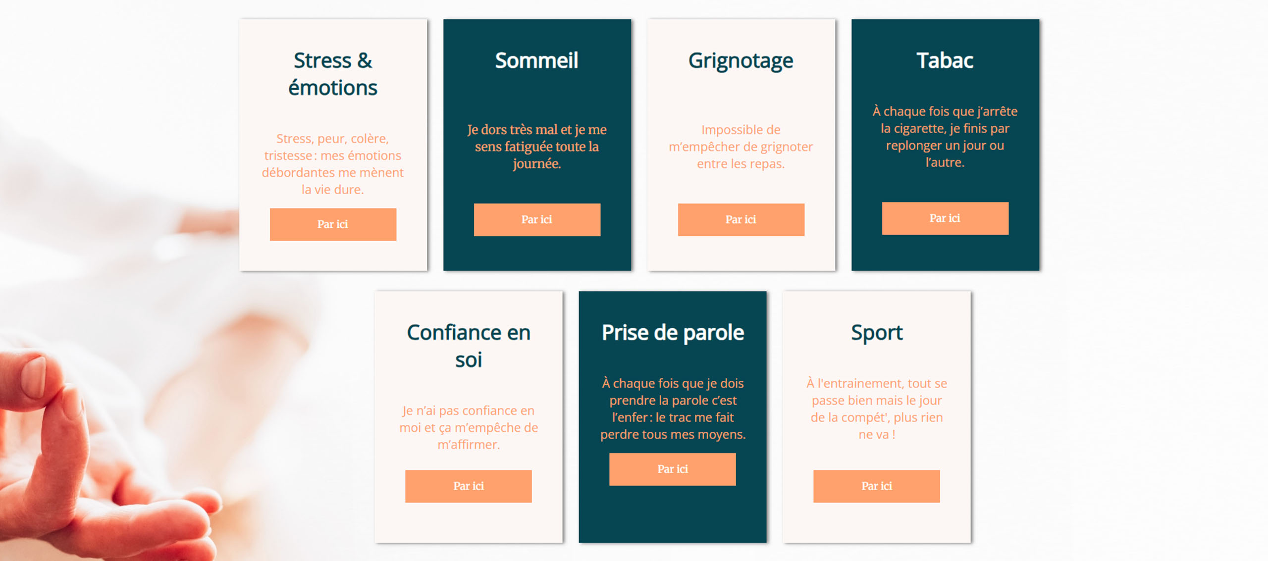 Parcours clair vers les pages "coaching de vie", "coaching professionnel" et "coaching des jeunes".