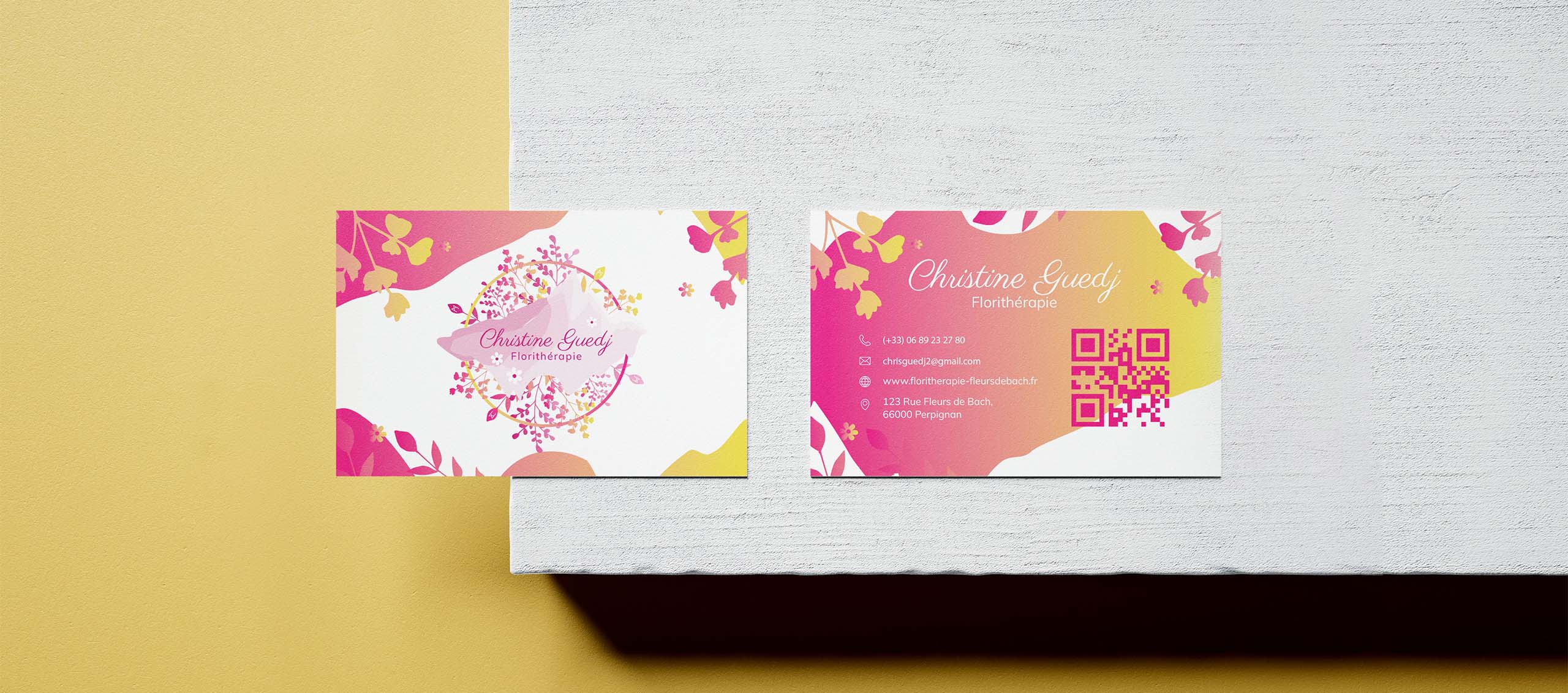 Création d’un logo très coloré, mêlant jaune éclatant, rose fuchsia et mauve violet, pour traduire l’énergie, la joie et la vitalité de la florithérapie.