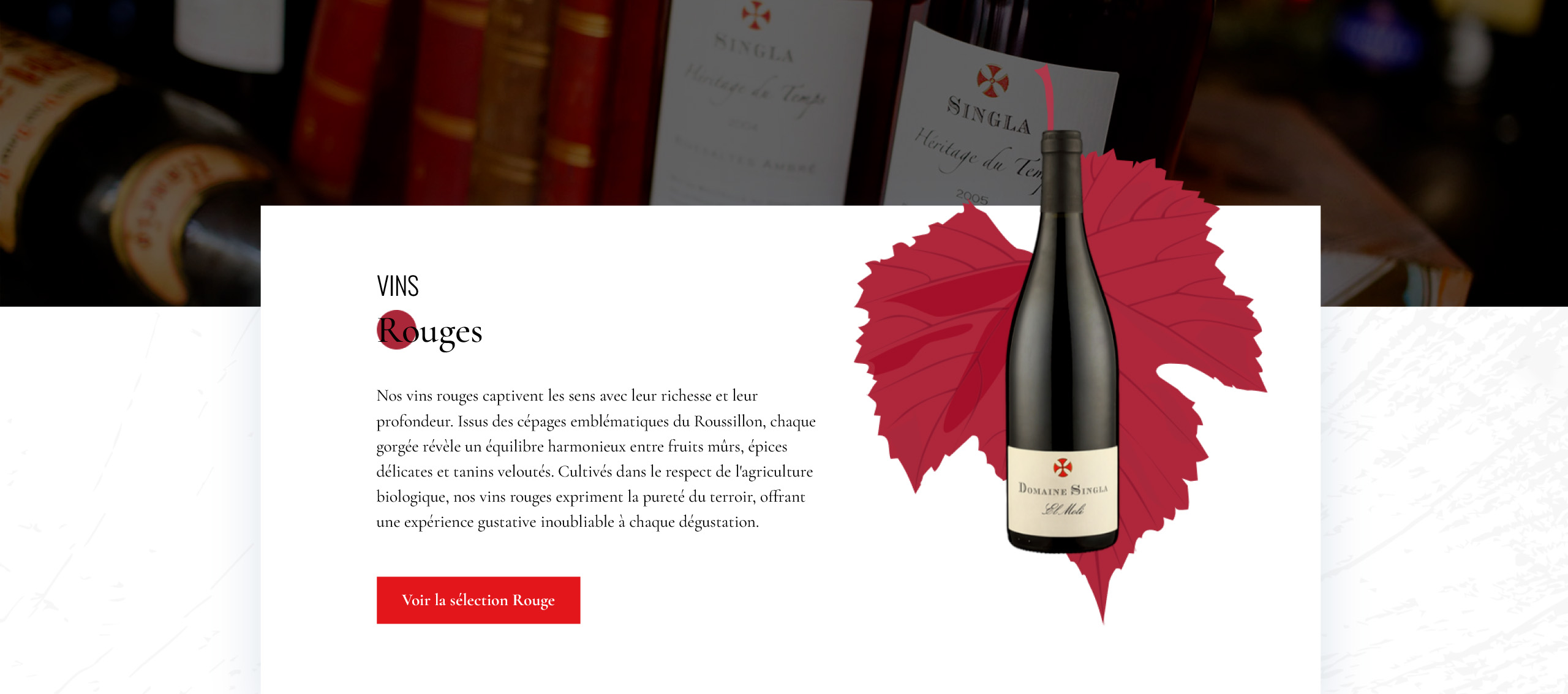 Chaque vin dispose de sa fiche complète avec visuel, description, accord mets-vins et notes de dégustation, dans un design sobre qui reflète l’univers du domaine.