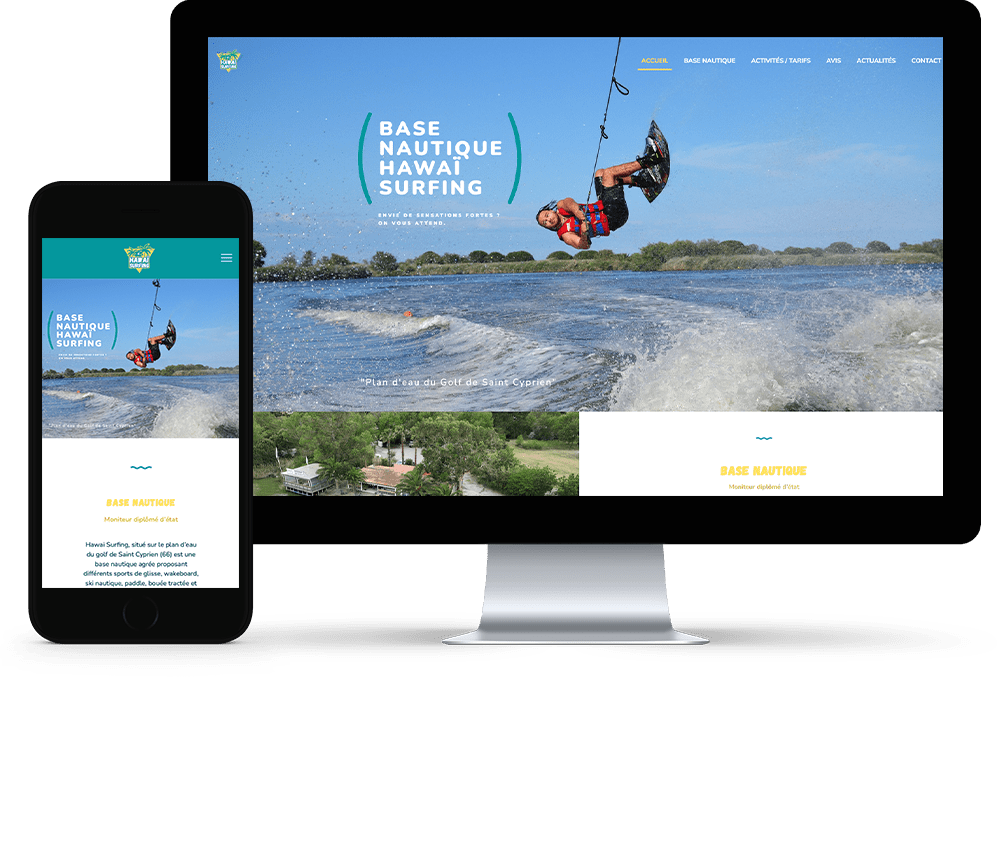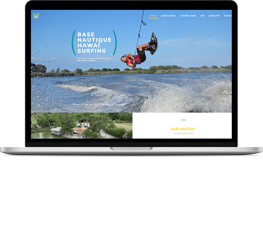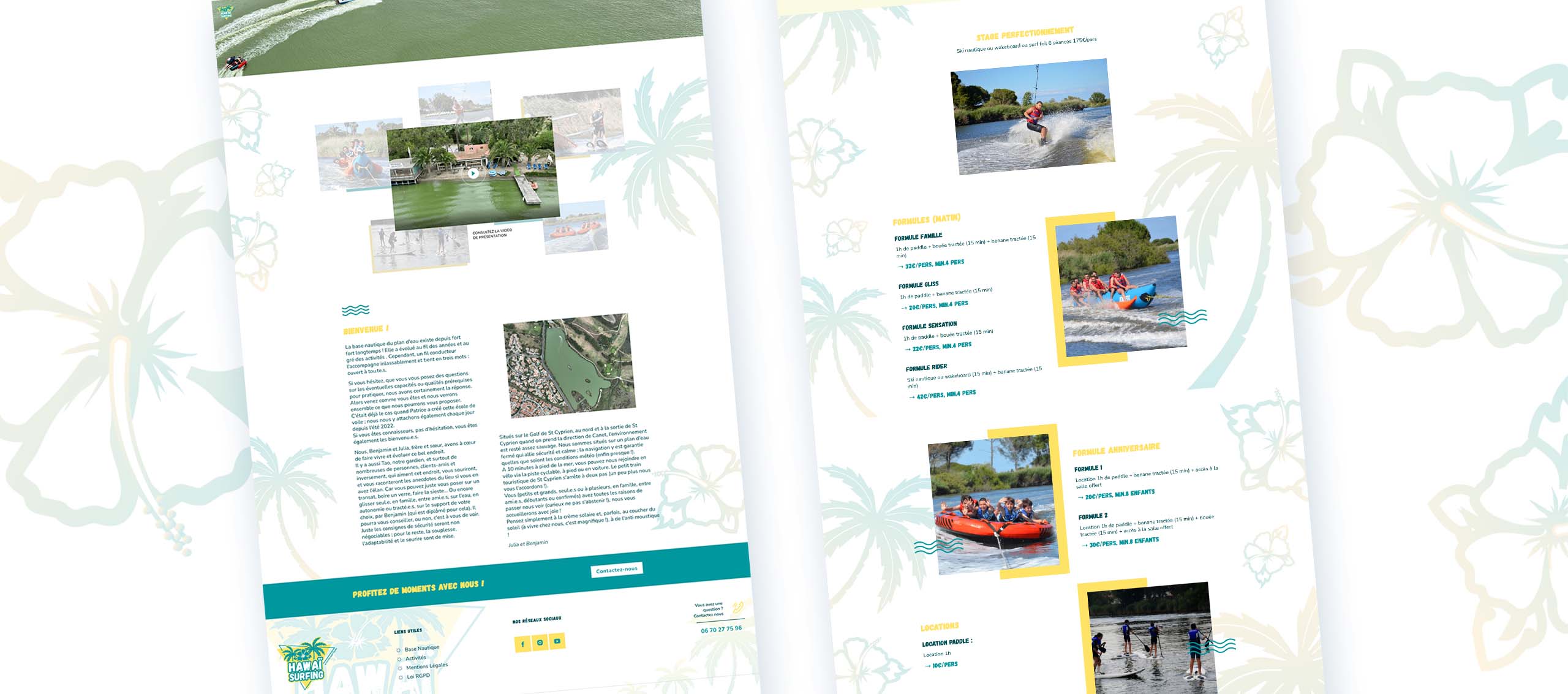 Pour Hawai Surfing, nous avons conçu une identité visuelle punchy et un site web immersif, à l’image de leurs activités nautiques variées : bouée tractée, flyboard, ski nautique, paddle, wakeboard, planche à voile…