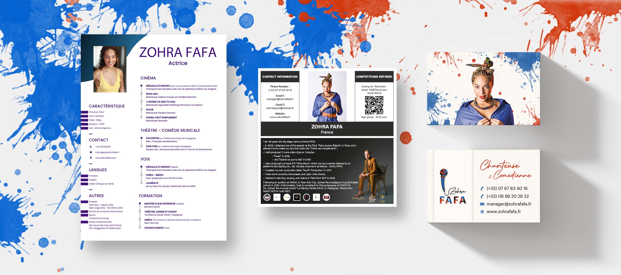 Pour accompagner Zohra Fafa dans la valorisation de sa carrière artistique, nous avons développé une identité visuelle complète et élégante, déclinée sur différents supports print, ainsi qu’un site vitrine à son image. L’ensemble met en valeur sa personnalité, son univers artistique et ses multiples talents.